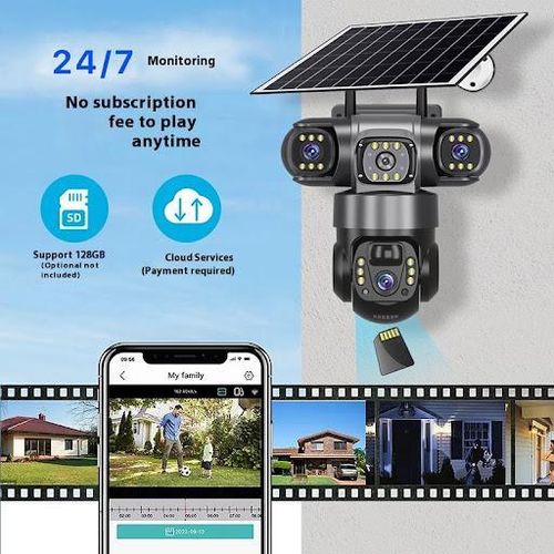 Secure your home or business with this advanced 4G Solar Powered PTZ Security Camera, designed for reliable outdoor surveillance without the need for Wi-Fi or constant power supply. Featuring a triple-lens system with three-screen viewing, this camera delivers enhanced coverage and detailed monitoring, ensuring no blind spots around your property.