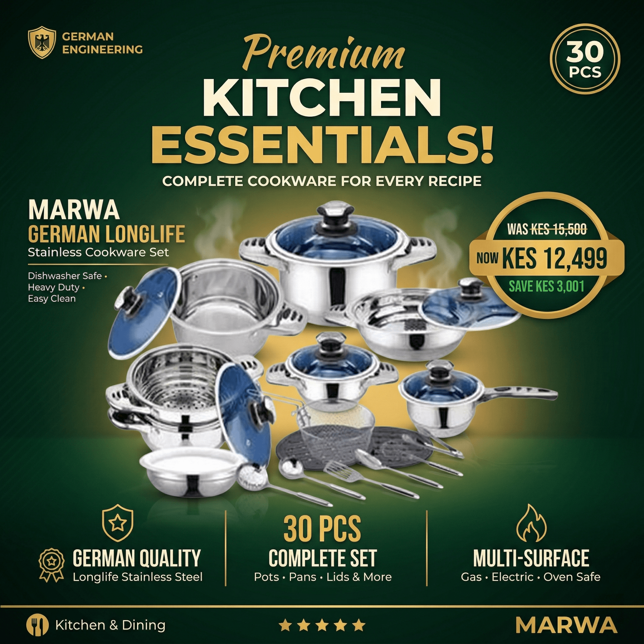 Investing in the Marwa German Longlife 30pcs Stainless Cookware Set is a commitment to culinary excellence. Bring the precision of German engineering into your kitchen and enjoy the durability, functionality, and elegance that this set brings to your cooking endeavors. Elevate your culinary experience today – order the Marwa German Longlife Cookware Set and embark on a journey of culinary mastery.